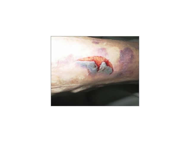 | Category 2b | A skin tear where the edges cannot be realigned to the normal anatomical position and the skin or flap colour is pale, dusky or darkened. IMAGE - M2 05 Category 2b Skin Tear |